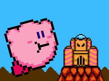 Storm through each door of DeDeDe's castle, and make your way through various one-screen levels. Touch the white Kirby to clear the pathway to the Boss! Defeat them all by inhaling their items, and sending them right back at 'em! Each Boss carries a Sparkling Star, collect them all to open the way to King DeDeDe himself! Let the adventure begin!